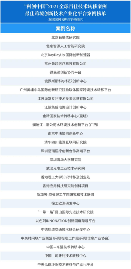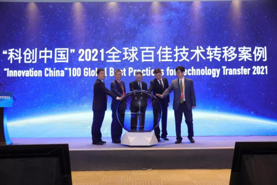 2021年9月6日,2021中国国际技术贸易论坛在国家会议中心召开。会议期间,由中国国际科技交流中心、中国科协新技术开发中心、国家科技评估中心、中国科技评估与成果管理研究会共同主办的《“科创中国”2021全球百佳技术转移案例》正式发布。院高创中心(中匈技术转移中心)在海内外250个具有代表性的技术转移相关案例中脱颖而出,入选“最佳跨境创新技术产业化平台案例”。中国科协原党组副书记、副主席齐让,科技部国家科技评估中心主任聂飙,中国科协新技术开发中心副主任秦久怡,中国国际科技交流中心副主任贾子文和科技部国际合作司原司长靳晓明等共同揭晓榜单。