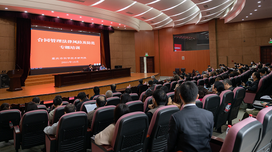 10月21日,我院在院一期三楼报告厅组织召开全院法律合同知识培训会,特邀院法律顾问、重庆百君律师事务所高级合伙人周炜律师作《合同管理法律风险及防范》专题培训,会议由院纪委书记曾学东主持,院机关处室负责人、院属机构领导班子成员、各单位、各部门合同管理和经办人员等共计110余名干部职工参加学习。