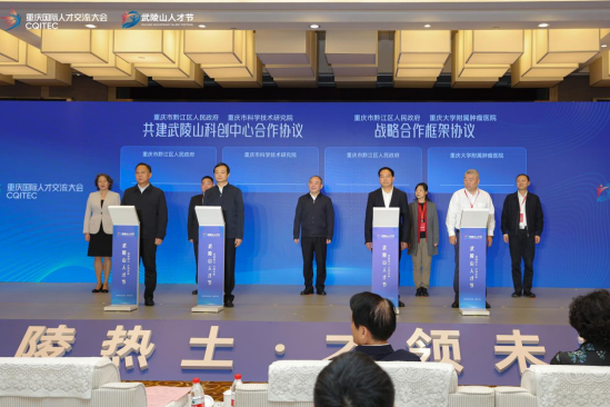 在开幕式上,黔江区人民政府与我院签署共建武陵山科创中心合作协议。院党委书记雷虹、重庆市科技局二级巡视员冯光鑫、黔江区委副书记、区长骆高燕等领导共同见证签约。武陵山科创中心与多家科研院所及企业签订了产学研合作协议。中国工程院院士、明月湖实验室主任潘复生与我院博士服务团亲切合影留念。