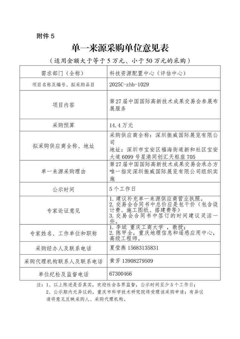 单一来源采购单位意见表